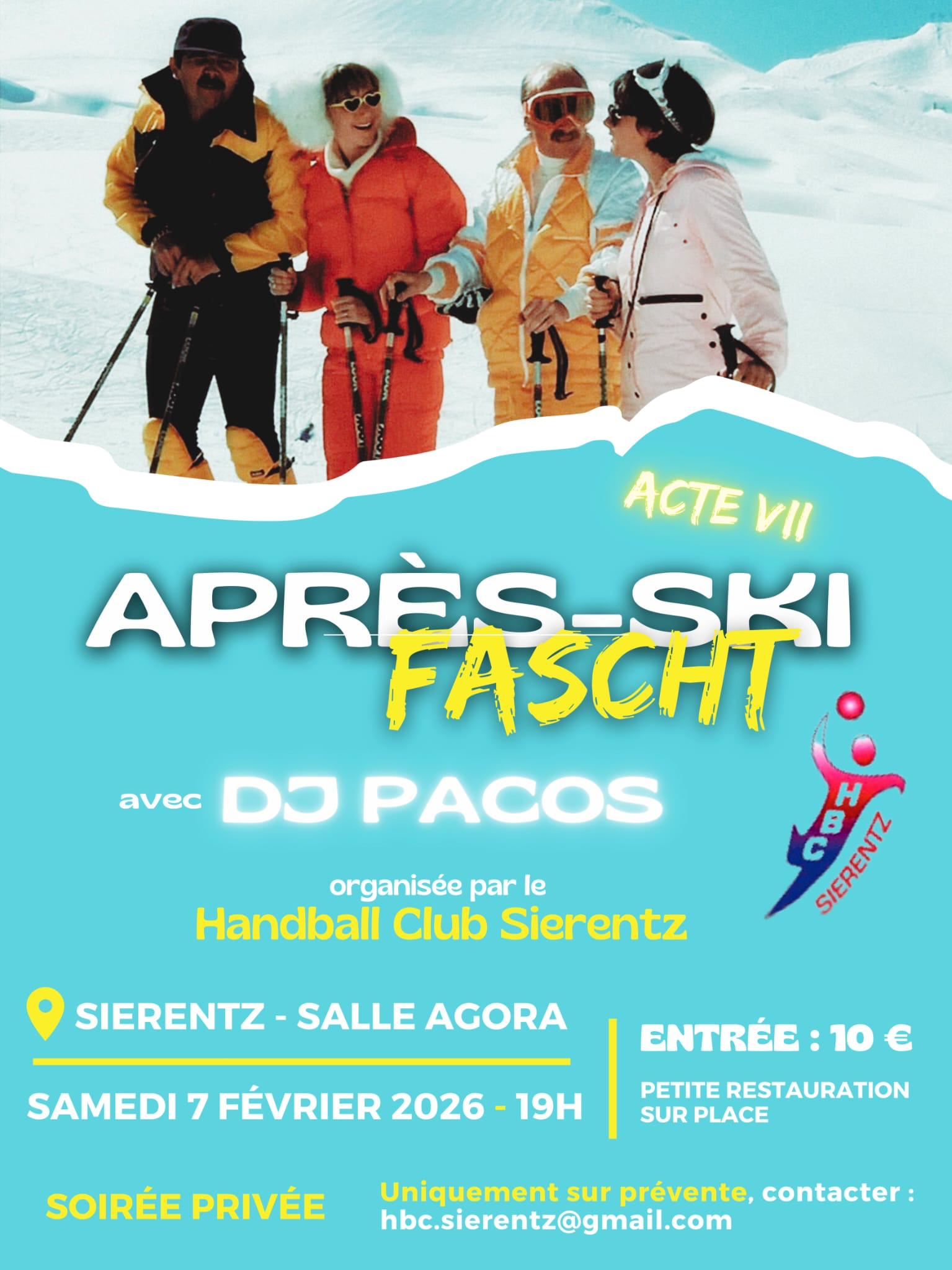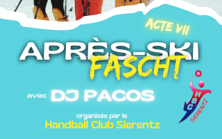 Le handball club de Sierentz organise son Après-Ski fascht Acte VII – avec DJ PACOS le samedi 7 février 2026, à la salle AGORA à 19h.