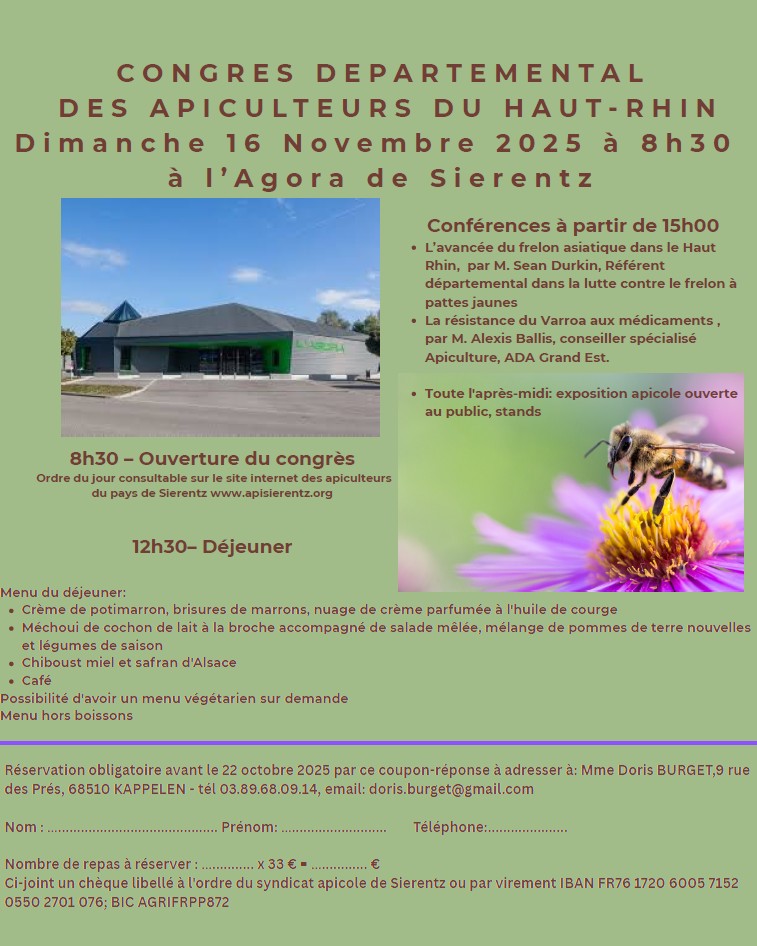 8h30 ouverture du congrès, ordre du jour consultable sur le site internet des apiculteurs du pays de Sierentz www.apisierentz.org – 12h30 déjeuner.